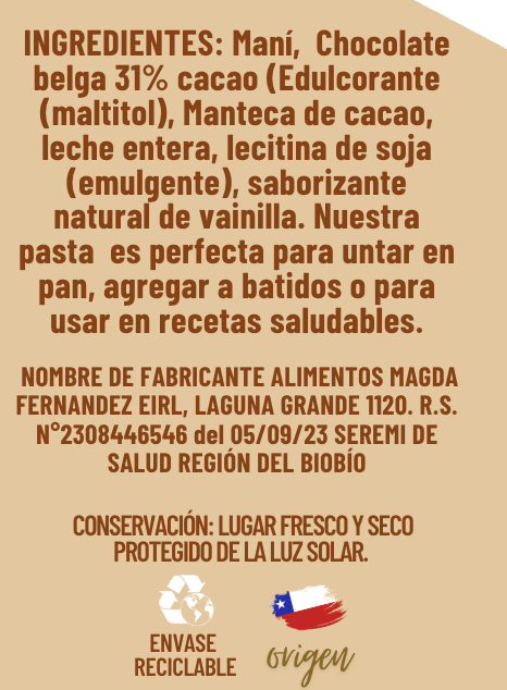 INGREDIENTES Bonobon 31% cacao : Maní Natural, Chocolate belga 31% cacao (Edulcorante (maltitol), Manteca de cacao, leche entera, lecitina de soja (emulgente), saborizante natural de vainilla.